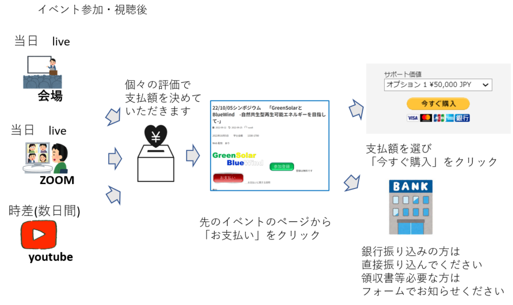 - 当日の時間帯(youtubeの場合は数日後まで)参加形態に合わせて、参加・視聴シてください。ここまでは支払いは発生しません。